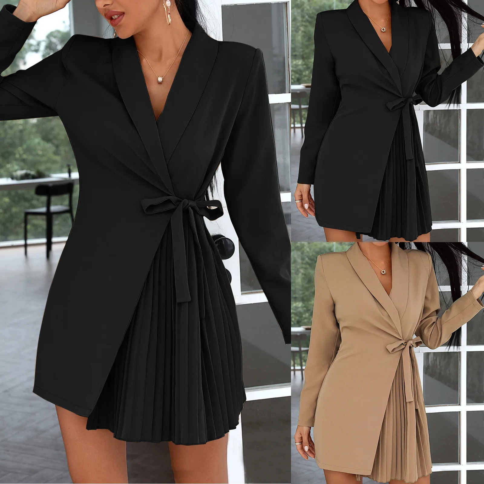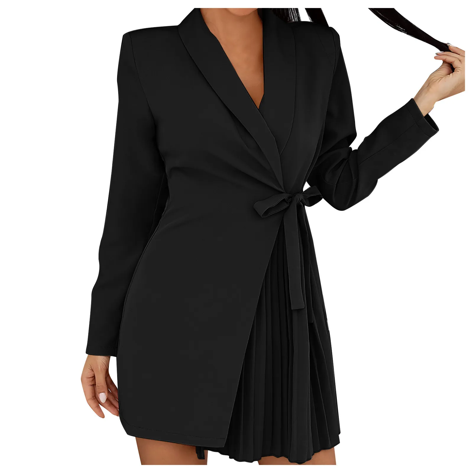 - Features: Women's Long Sleeve Suit Dress, Solid Color Lace Up Pleated Coat Dress