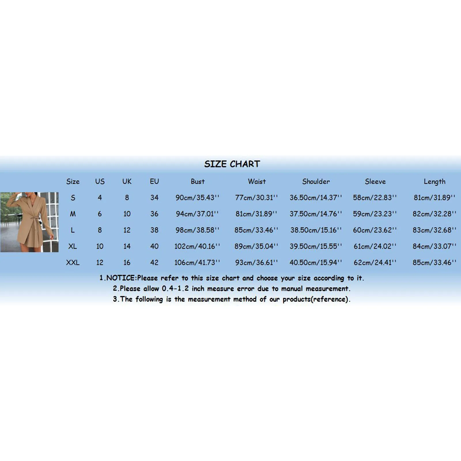 Size:S US:4 UK:8 EU:34 Bust:90cm/35.43'' Waist:77cm/30.31'' Shoulder:36.50cm/14.37'' Sleeve:58cm/22.83'' Length:81cm/31.89'' Size: US:6 UK:10 EU:36 Bust:94cm/37.01'' Waist:81cm/31.89'' Shoulder:37.50cm/14.76'' Sleeve:59cm/23.23'' Length:82cm/32.28'' Size: US:8 UK:12 EU:38 Bust:98cm/38.58'' Waist:85cm/33.46'' Shoulder:38.50cm/15.16'' Sleeve:60cm/23.62'' Length:83cm/32.68'' Size: US:10 UK:14 EU:40 Bust:102cm/40.16'' Waist:89cm/35.04'' Shoulder:39.50cm/15.55'' Sleeve:61cm/24.02'' Length:84cm/33.07'' Size: XXL US:12 UK:16 EU:42 Bust:106cm/41.73'' Waist:93cm/36.61'' Shoulder:40.50cm/15.94'' Sleeve:62cm/24.41'' Length:85cm/33.46''
