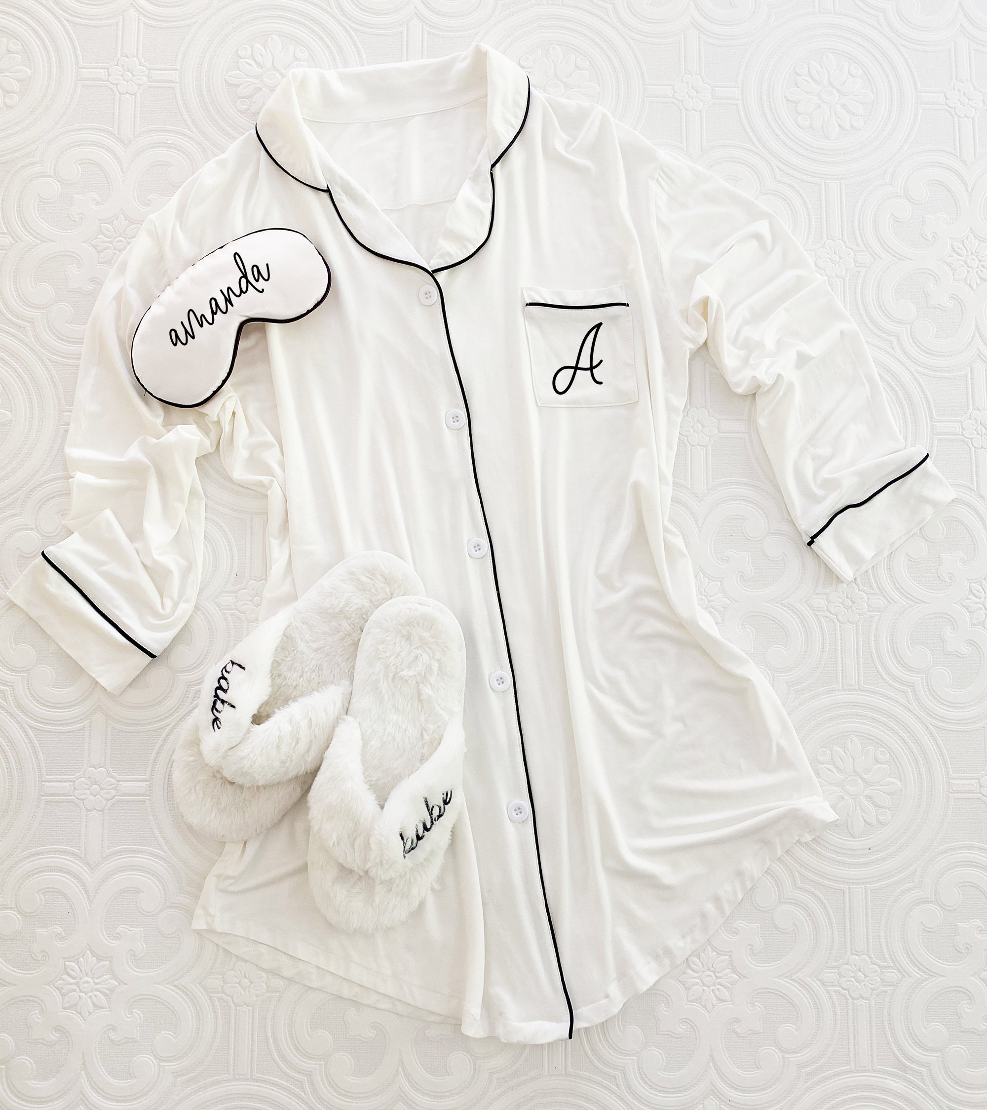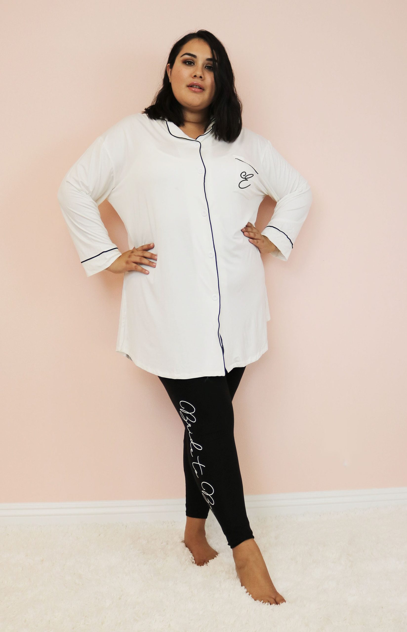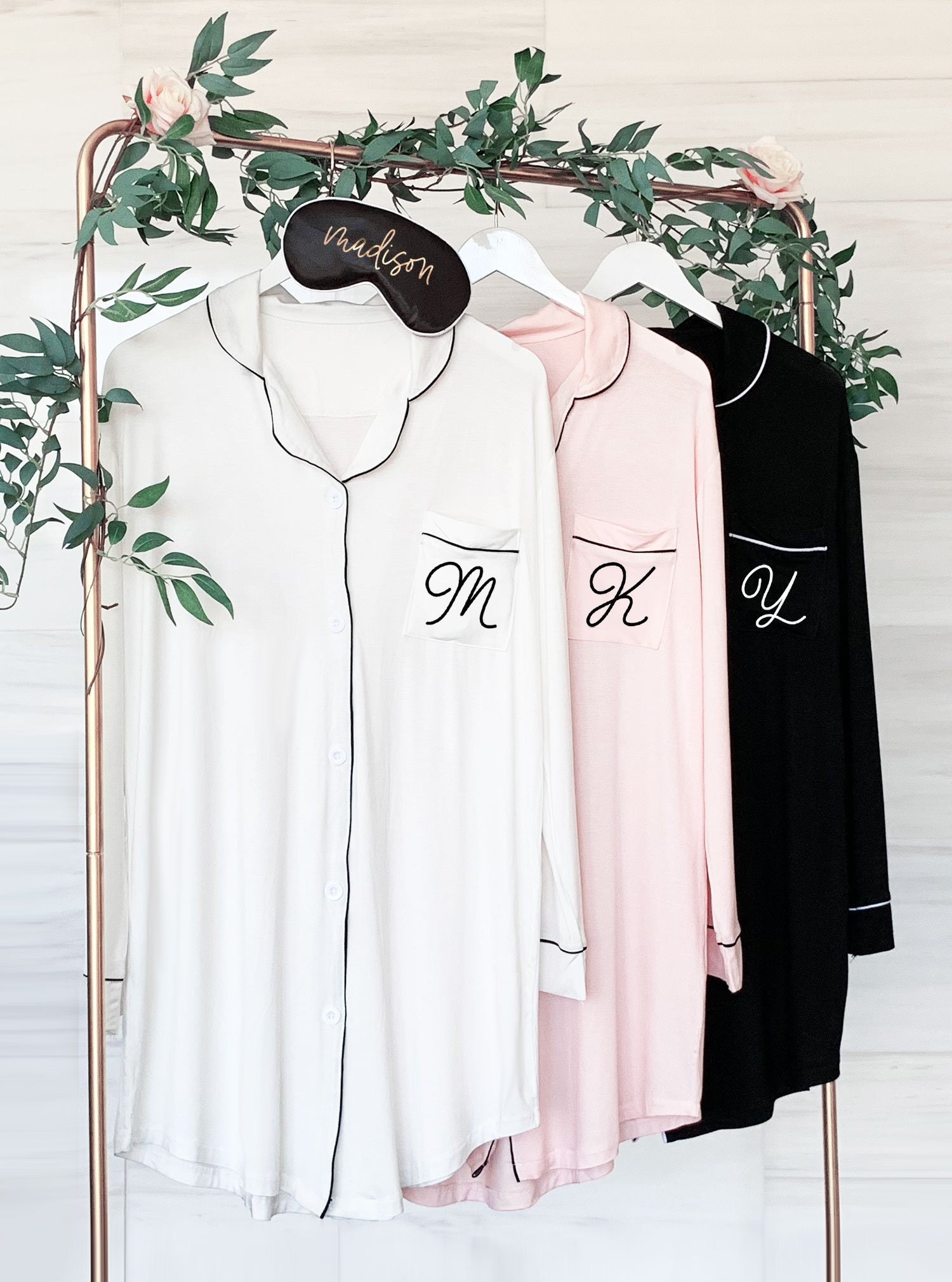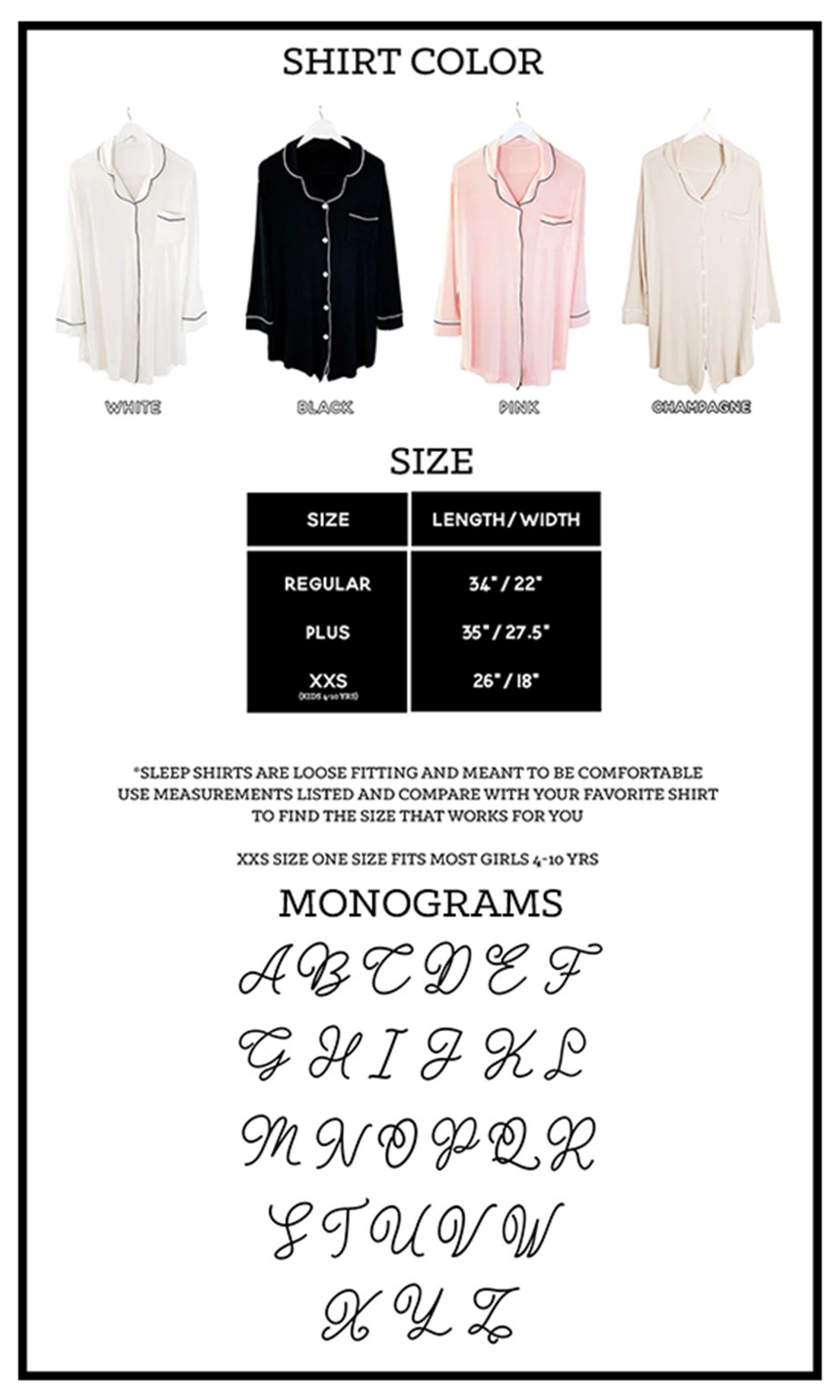 Bridesmaid Sleep Shirts make cute Pajamas for the girls to wear at your bachelorette party weekend or for getting ready in on your wedding day! Our super soft and stretchy modal cotton shirts are button down and with contrast piping. Each shirt comes printed with a script monogram on the front pocket. ----------------------------------------------- ***Details*** Listing is for 1 Sleep Shirt - you can choose the color of the shirt. SHIRT ONLY - other items not included but available in our shop. Sizes: XXS - fits most girls 4-10 | Length: 26" x Width 18" REGULAR - one size fits most XS-L PLUS - one size fits most XL- 3XL Fabric – Cotton Modal (stretchy and soft) ----------------------------------------------- ***HOW TO ORDER MORE THAN ONE*** 1. Choose your shirt color/monogram choice from the drop down and add each shirt to your cart one at a time. 2. Your shipping will automatically combine when ordering multiples. 3. Checkout out all at once when the correct color and qty has been added. CARE INSTRUCTIONS: delicate cycle wash, hang dry, do not bleach - iron/steam on low heat only. NO RETURNS OR EXCHANGES ON CLOTHING ITEMS. ----------------------------------------------- ★SLEEP MASKS★ https://www.etsy.com/listing/1745854064/personalized-sleep-mask-gift-idea-for?click_key=4bd75f36846632a0bb2f4f2499646879de107550%3A1745854064&click_sum=ed421c8e&ref=shop_home_active_9&crt=1&sts=1 ★MAKEUP BAGS★ https://www.etsy.com/listing/1807911805/personalized-makeup-bag-cosmetic-bags?click_key=ca1a473e9ee9c92218278f3f53405ff1aa275541%3A1807911805&click_sum=097d0744&ga_search_query=EB3526&ref=shop_items_search_1&pro=1&sts=1 ★BRIDESMAID GIFTS★ https://www.etsy.com/shop/ModParty/search?order=date_desc&view_type=gallery&ref=shop_search§ion_id=18821834