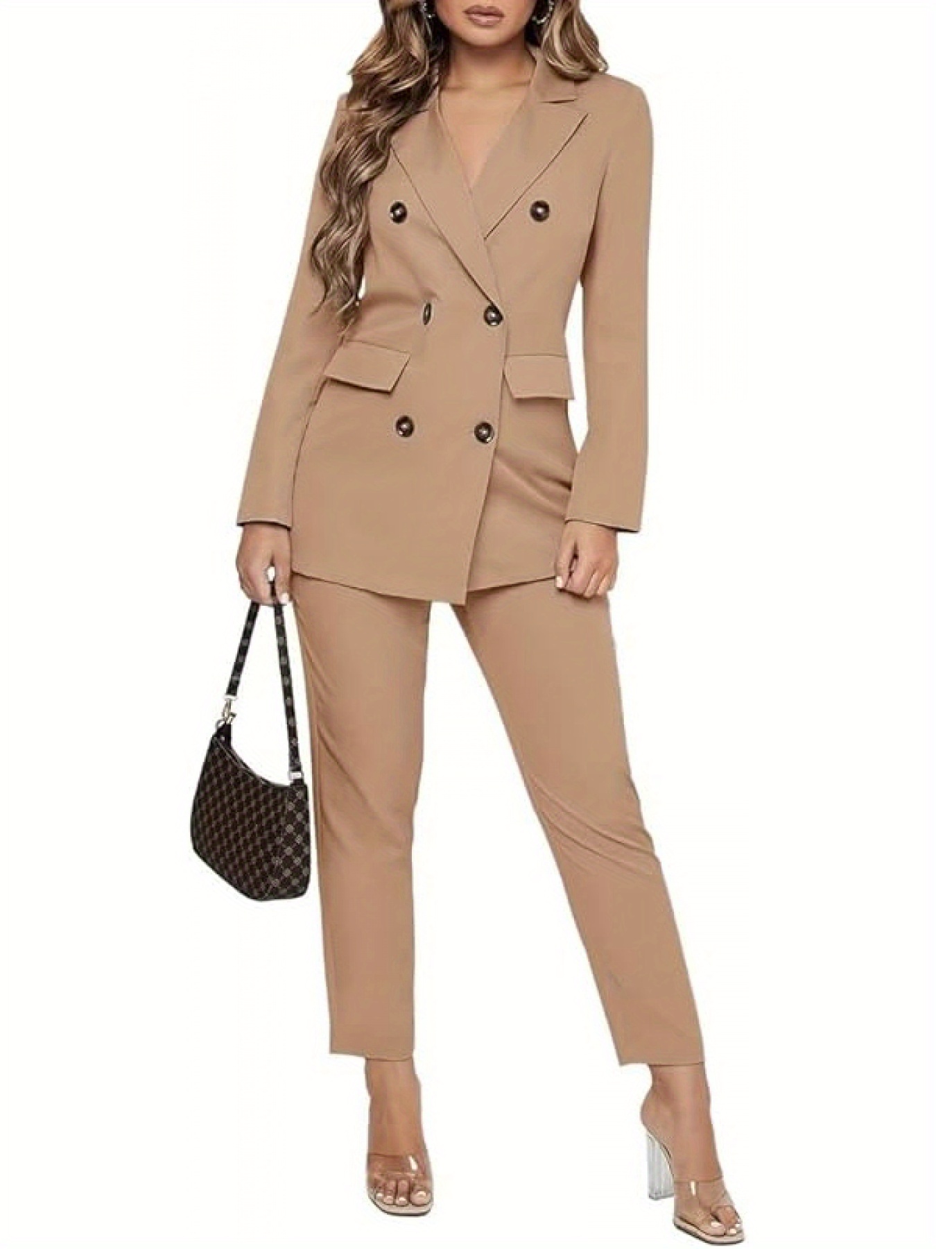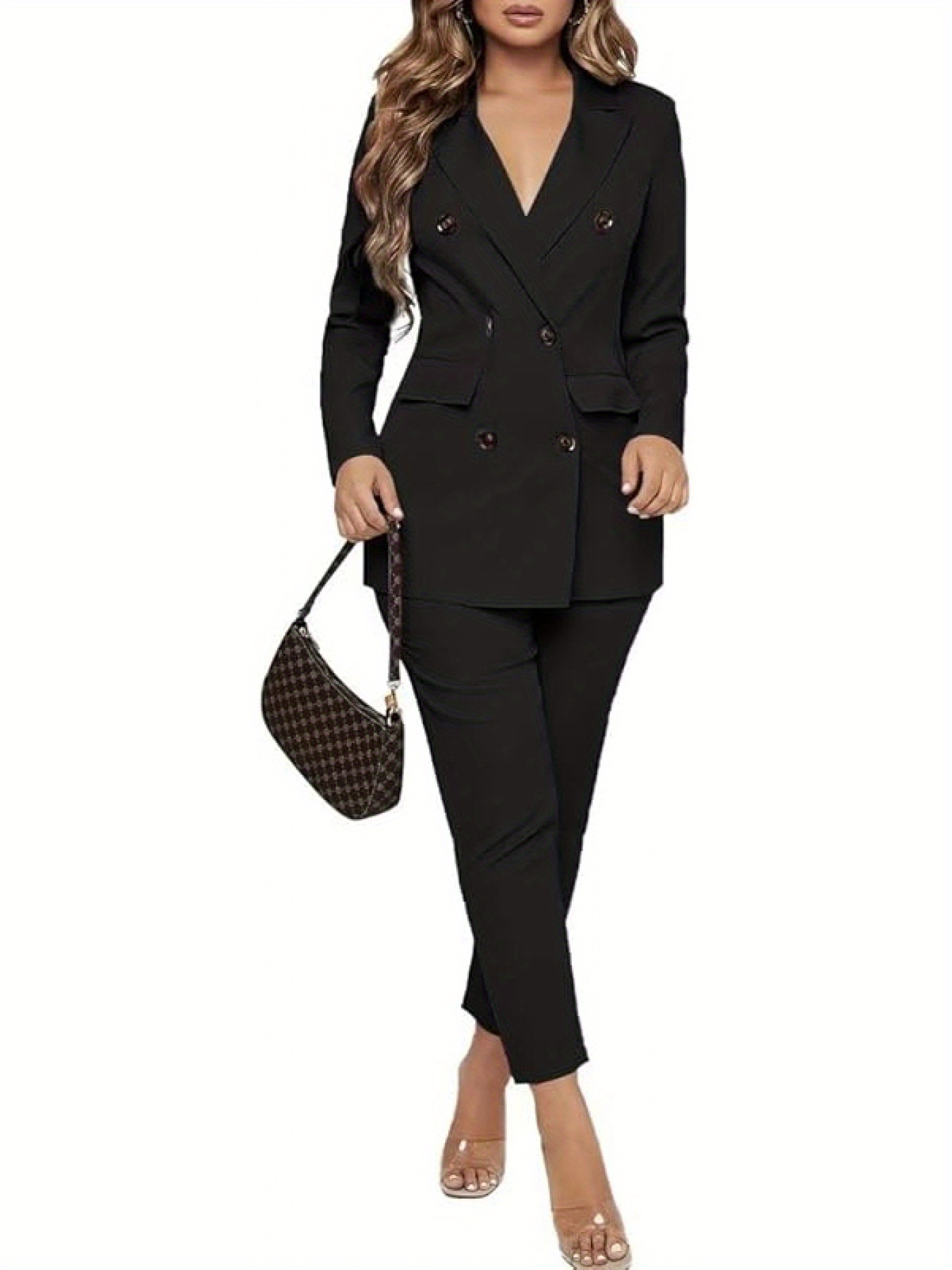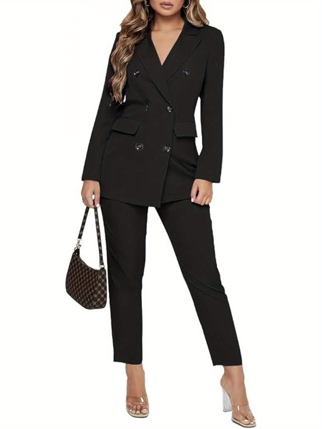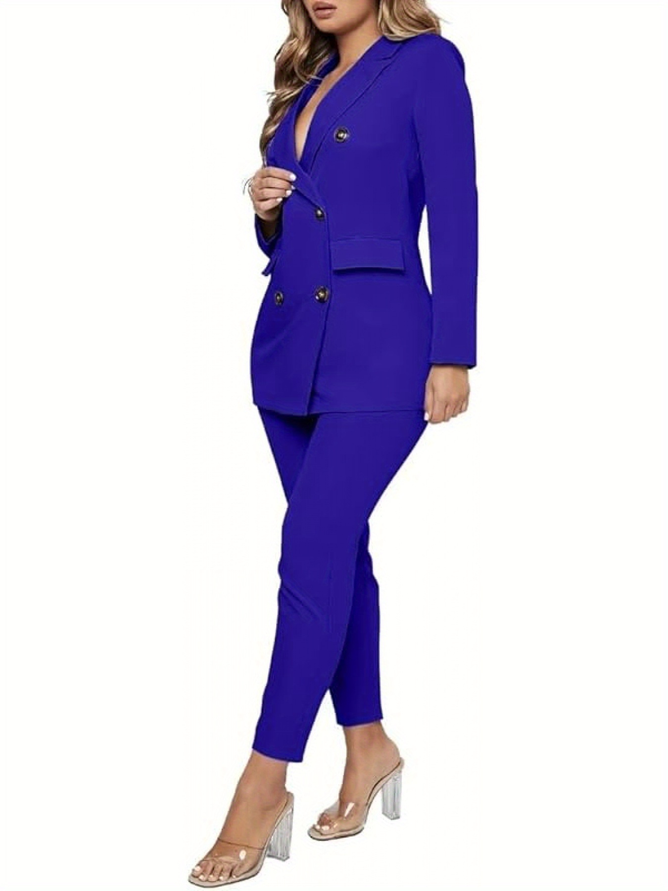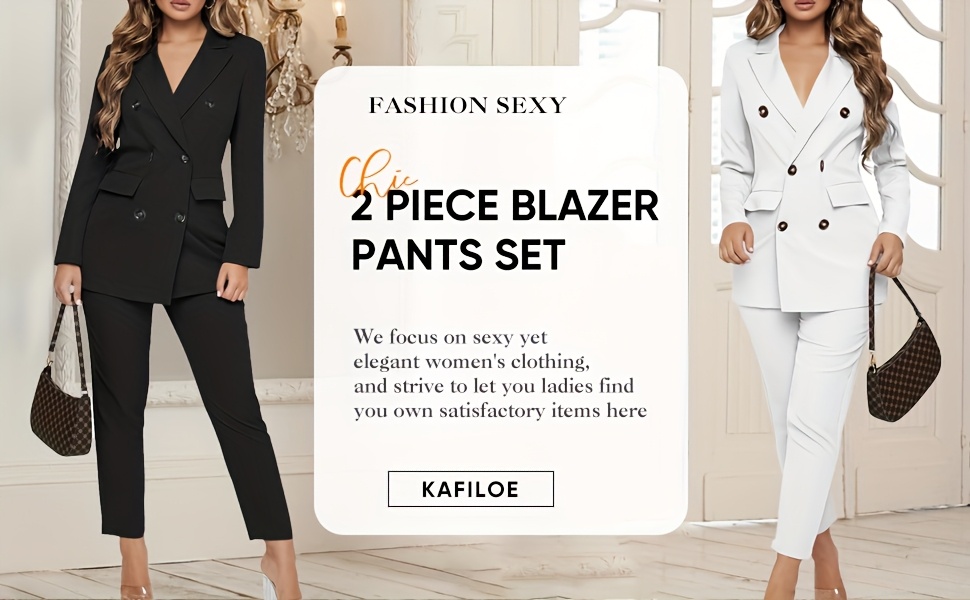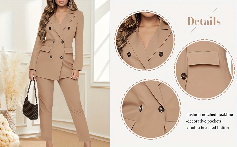 This is a formal women's two-piece blazer set featuring long sleeves and a double-breasted button design, making it a unique choice for business attire. It is suitable for various occasions such as parties, evening events, clubs, weddings, casual outings, cocktails, birthdays, funerals, and daily office work, as well as formal events like Christmas and New Year's Eve.