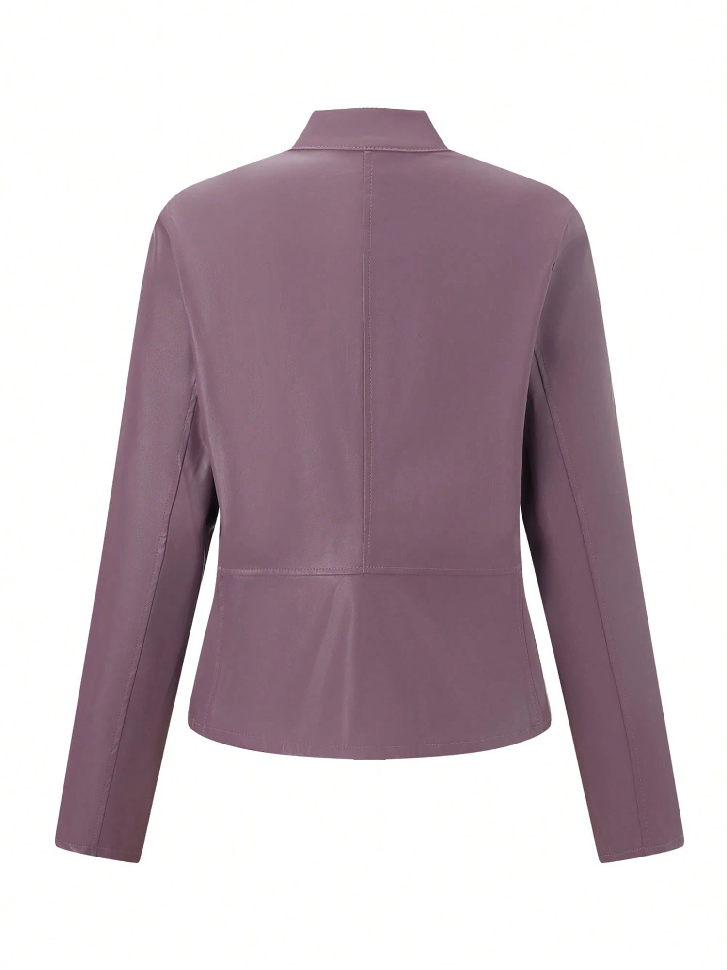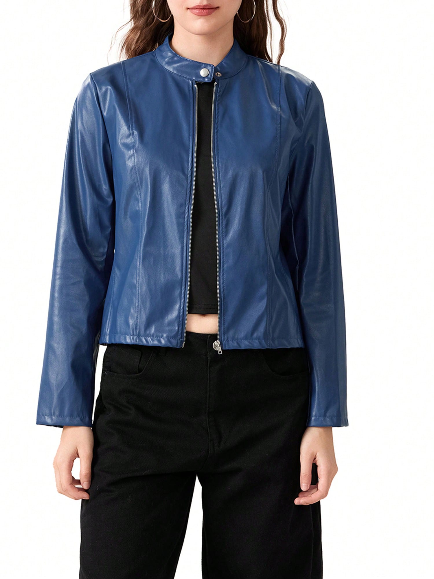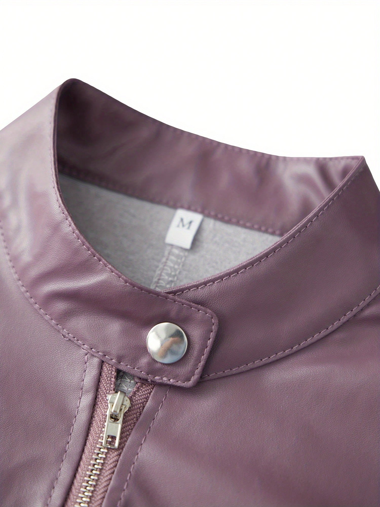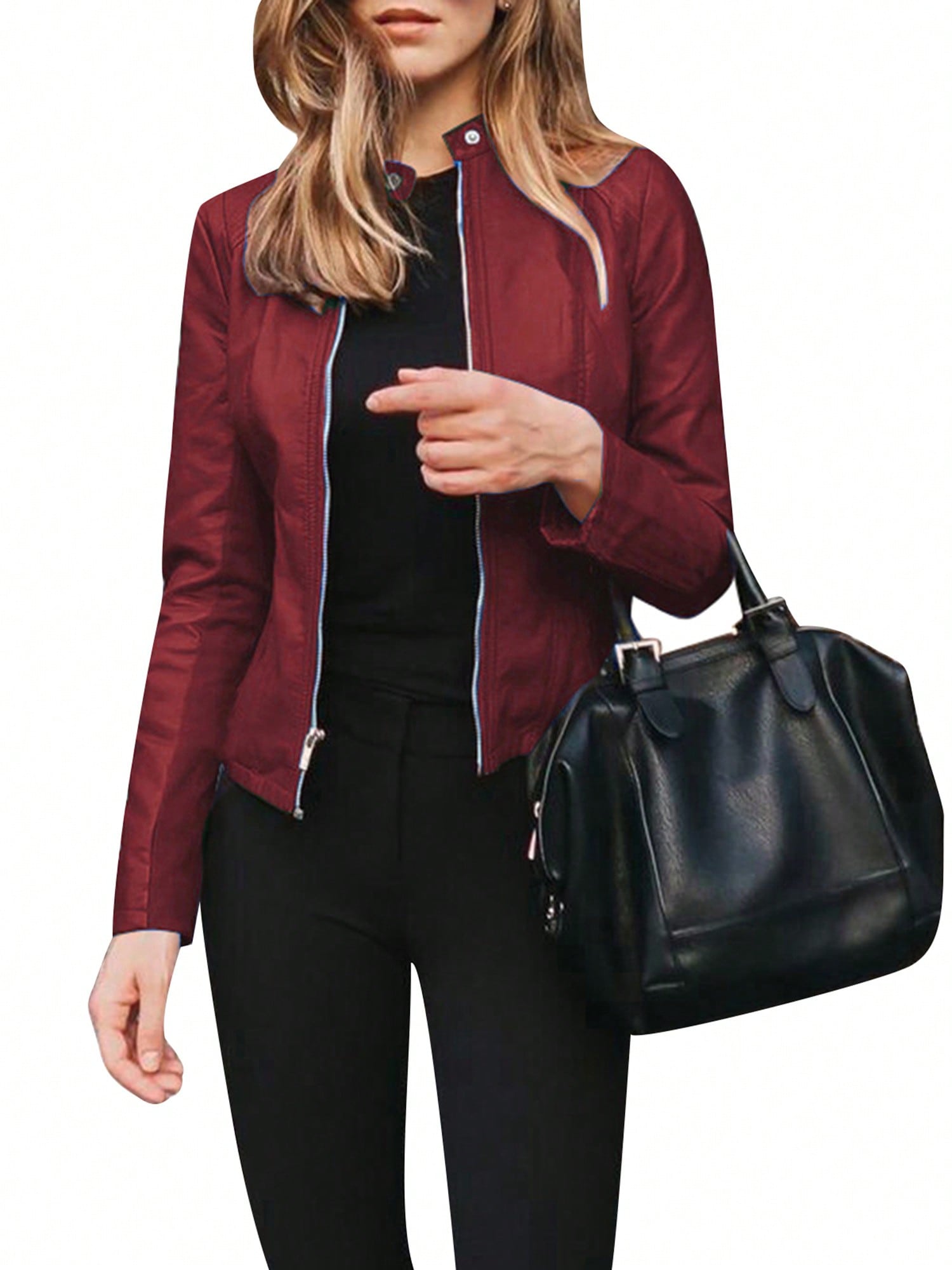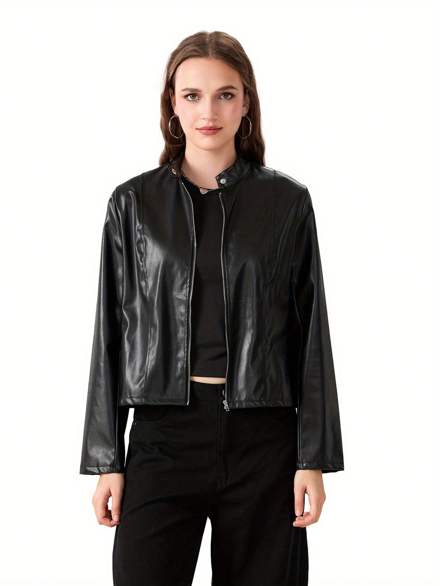 Women's Faux Leather Jacket, Slim Moto Biker Jacket Outerwear, Long Sleeve Zipper Short Jacket